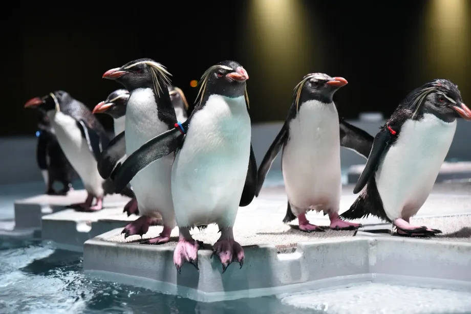 キタイワトビペンギンは、体長約55〜65cm、頭部の黄色い飾り羽がトレードマークで、岩場をジャンプして移動する姿が特徴です。