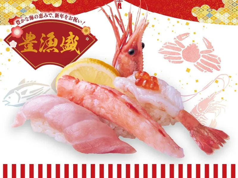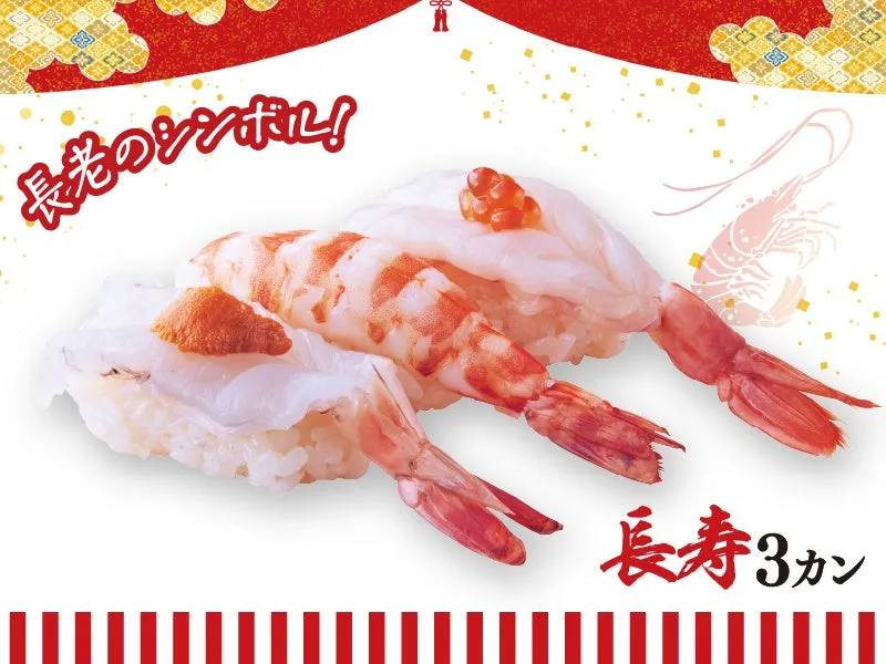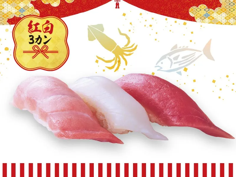 新年にふさわしい本まぐろ大とろ、いか、本まぐろ上赤身を組み合わせた「紅白3カン」。その名の通り、赤と白のコントラストが美しい、華やかな握りです。年迎えの席を彩るにはぴったりで、見た目も味も楽しめます。大とろまで含まれて700円(税込770円)という価格は嬉しい驚きですね。新年の気分を盛り上げてくれる、手軽に楽しめる贅沢です。