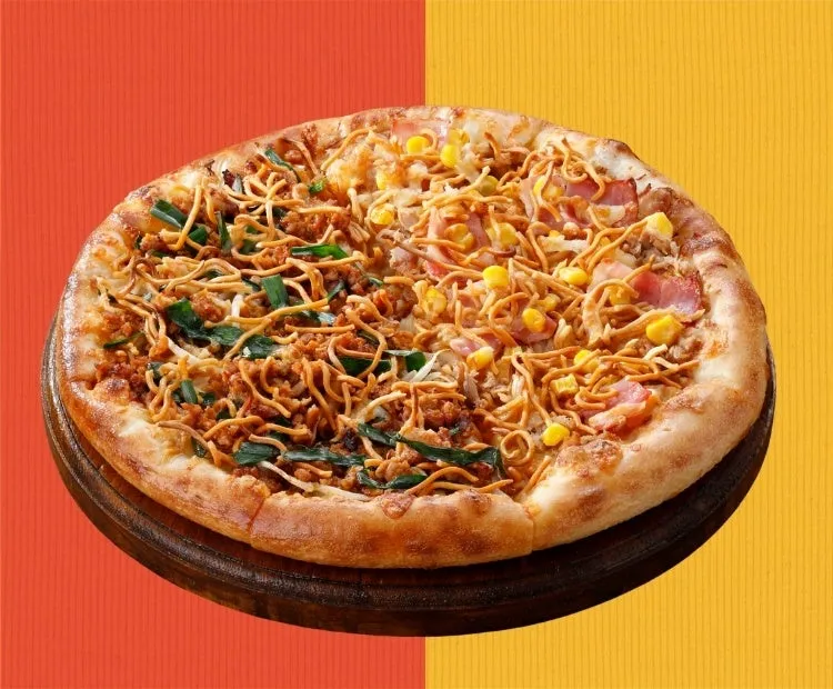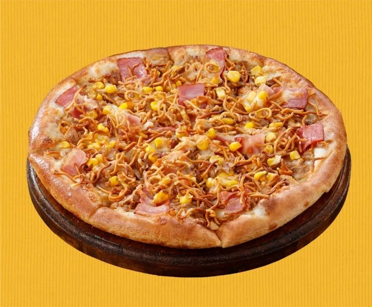 こちらは、お子さんから大人までみんなが笑顔になれるような、ハッピーな一枚です!ベビースターラーメンに、みんなが大好きなツナ、ベーコン、コーンを組み合わせ、仕上げにまろやかなマヨネーズをたっぷり。ベビースターの塩味とチキン味が、マヨネーズのコク、ツナの旨味、コーンの甘みと見事に調和するのではないでしょうか。彩りも豊かで、見た目も楽しいピザは、パーティーシーンにもぴったりですね。