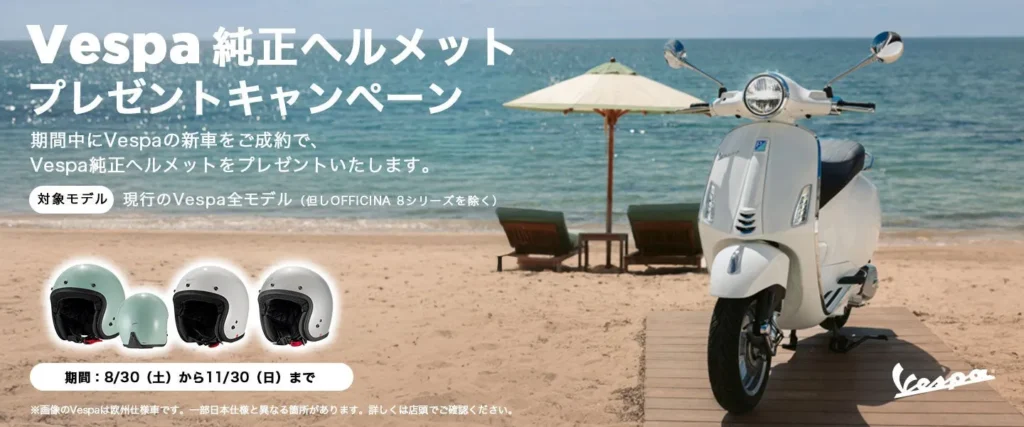 ベスパの新車購入を検討中の方に朗報です!今なら約2万円相当の純正ヘルメットが無料で手に入るキャンペーンが開催中。車両と完璧にコーディネートされたヘルメットで、安全かつスタイリッシュなベスパライフをすぐに始められる絶好のチャンス。キャンペーンの詳細から純正ヘルメットの魅力まで、この記事でご紹介します。