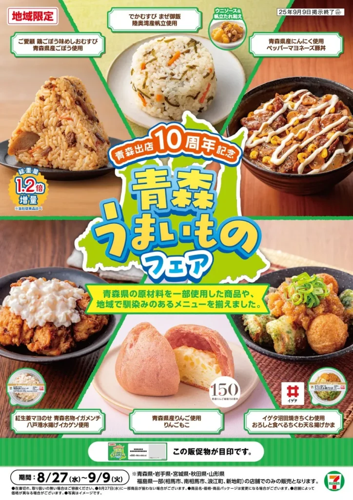 セブン-イレブンが青森県出店10周年を記念し、東北6県で「青森うまいものフェア」を期間限定で開催します。陸奥湾産の帆立や青森県産にんにく、ふじりんごなど、地元の食材を贅沢に使った限定6品が登場。通勤途中やランチタイムに、手軽に青森の豊かな食文化と旅気分を味わえるこの特別な機会を、ぜひお見逃しなく。